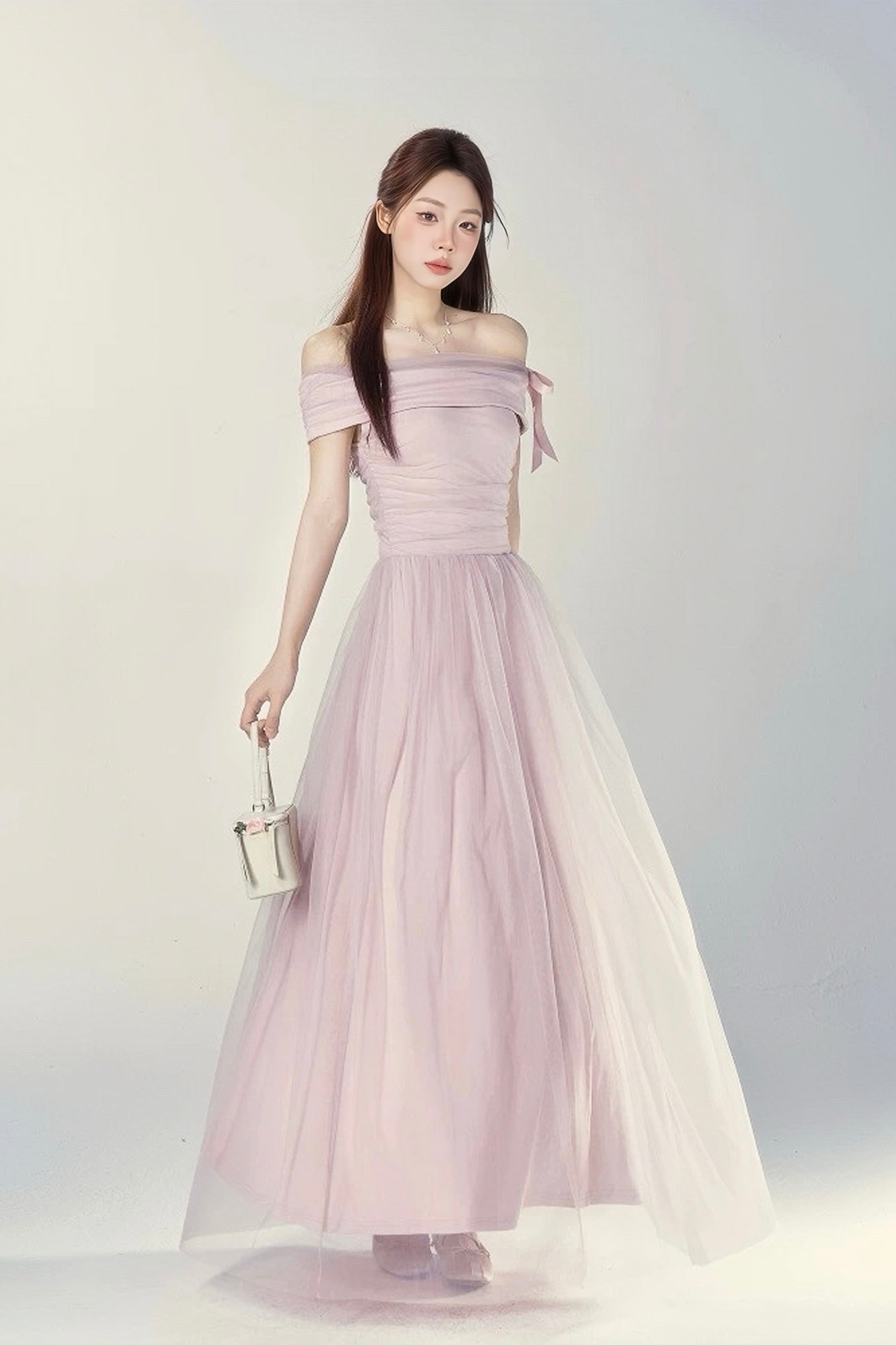 Step into elegance with our Blush Pink Off-Shoulder Tulle Maxi Dress, a dreamy piece designed for weddings, evening parties, and special occasions. Crafted with layers of airy tulle, this gown drapes beautifully, while the off-shoulder neckline with delicate ribbon details adds a touch of romance. The fitted bodice accentuates your silhouette, flowing into a soft A-line skirt that moves gracefully with every step.