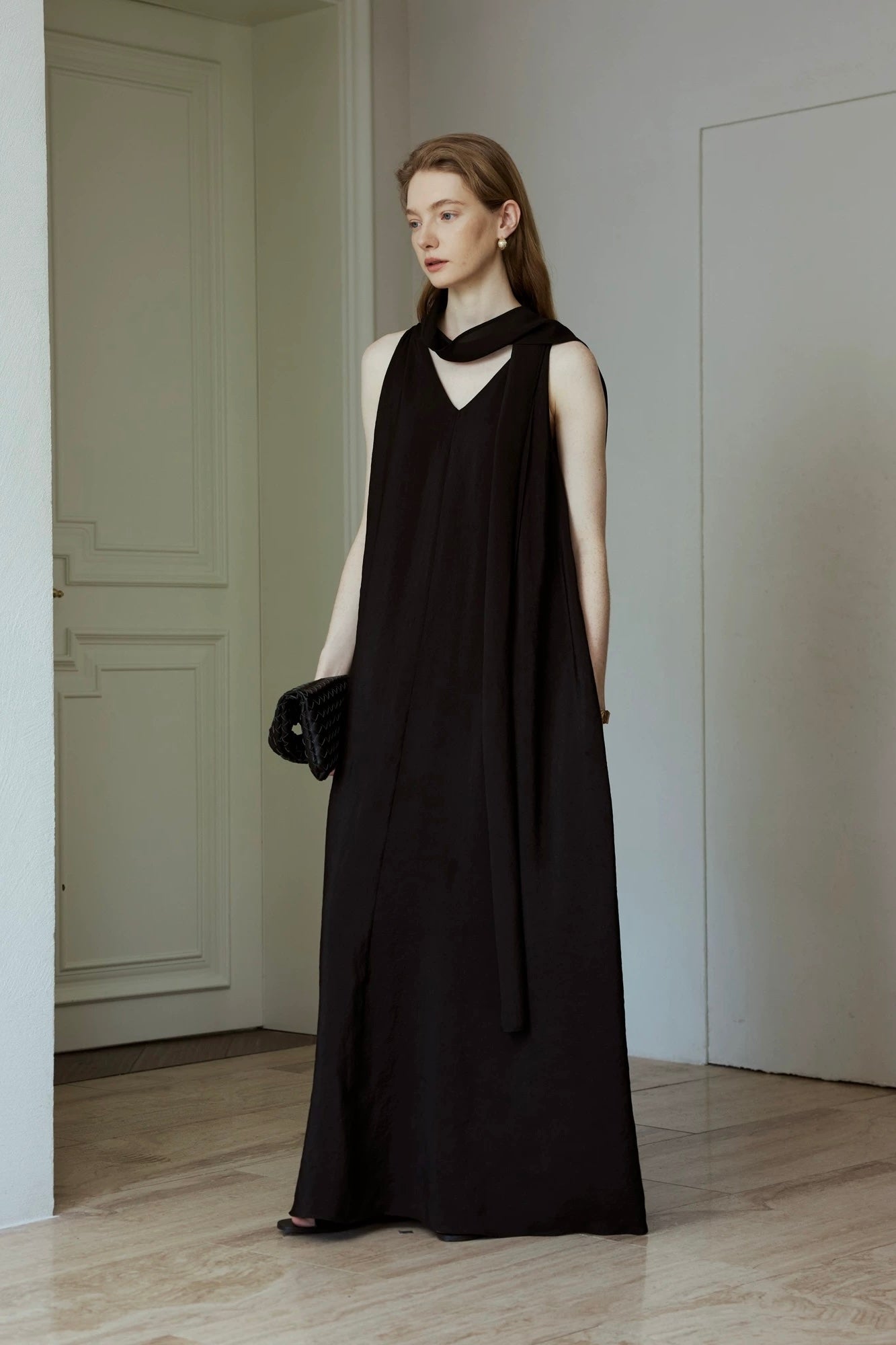 Woman in a black dress holding a matching clutch in a minimalistic setting