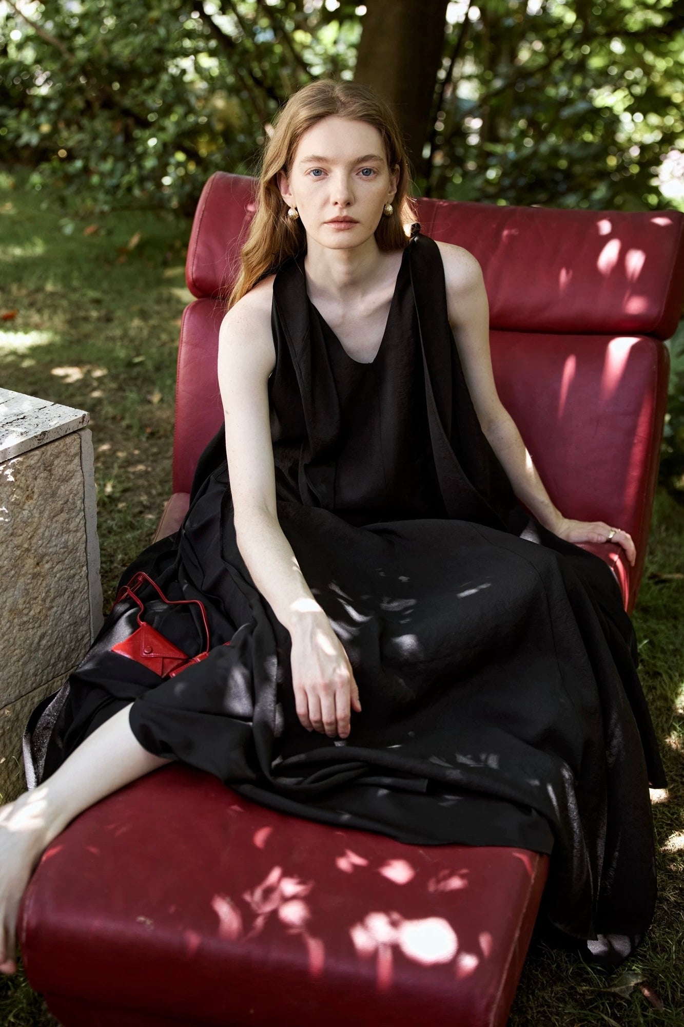 Woman in a black dress sitting on a red chair outdoors