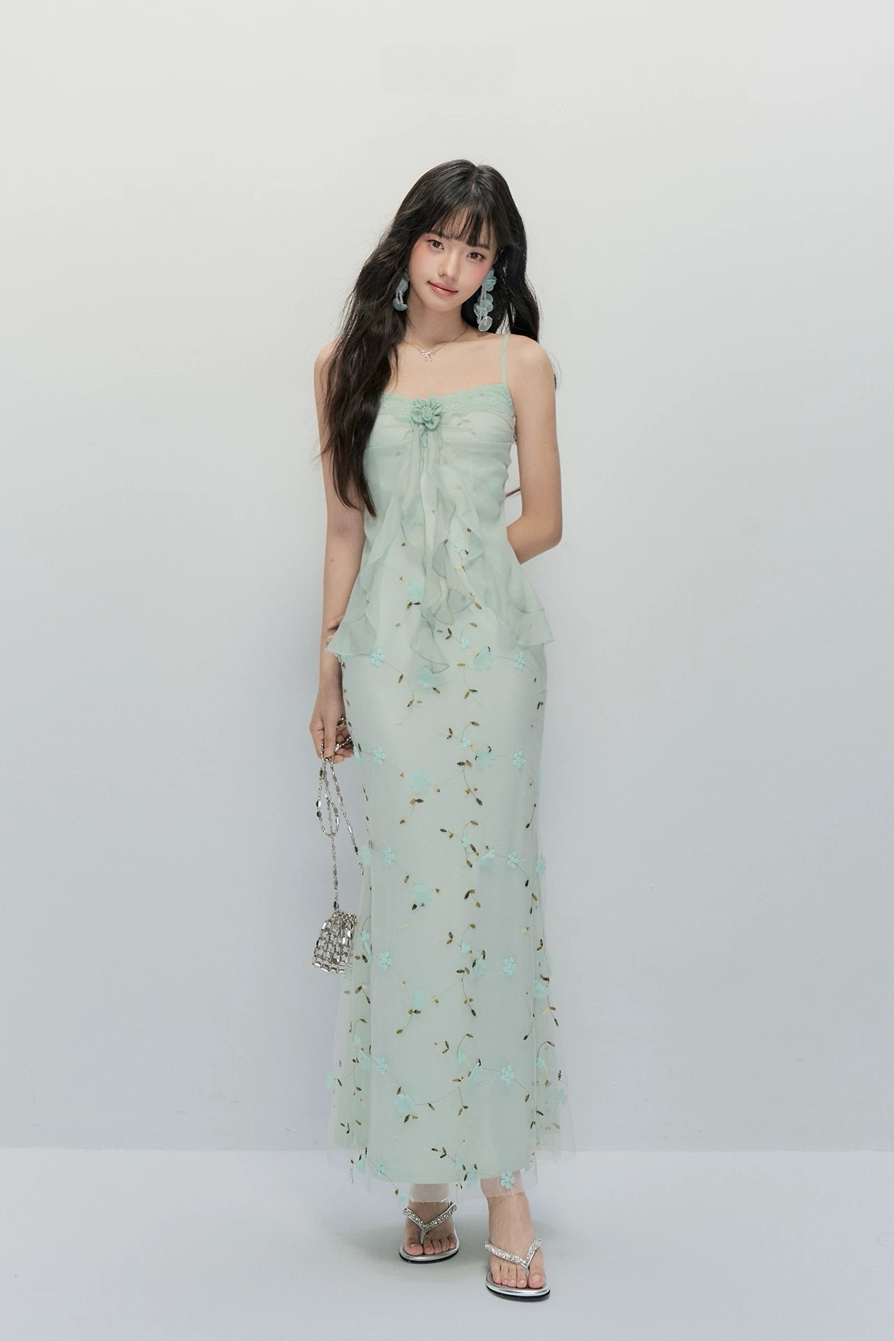 Floral Maxi Vacation Dress in Blush Pink & Lemon Green – Summer Beach Holiday Outfit, Resort Wear, Wedding Guest Dress, Romantic Chiffon Ruffle Evening Gown