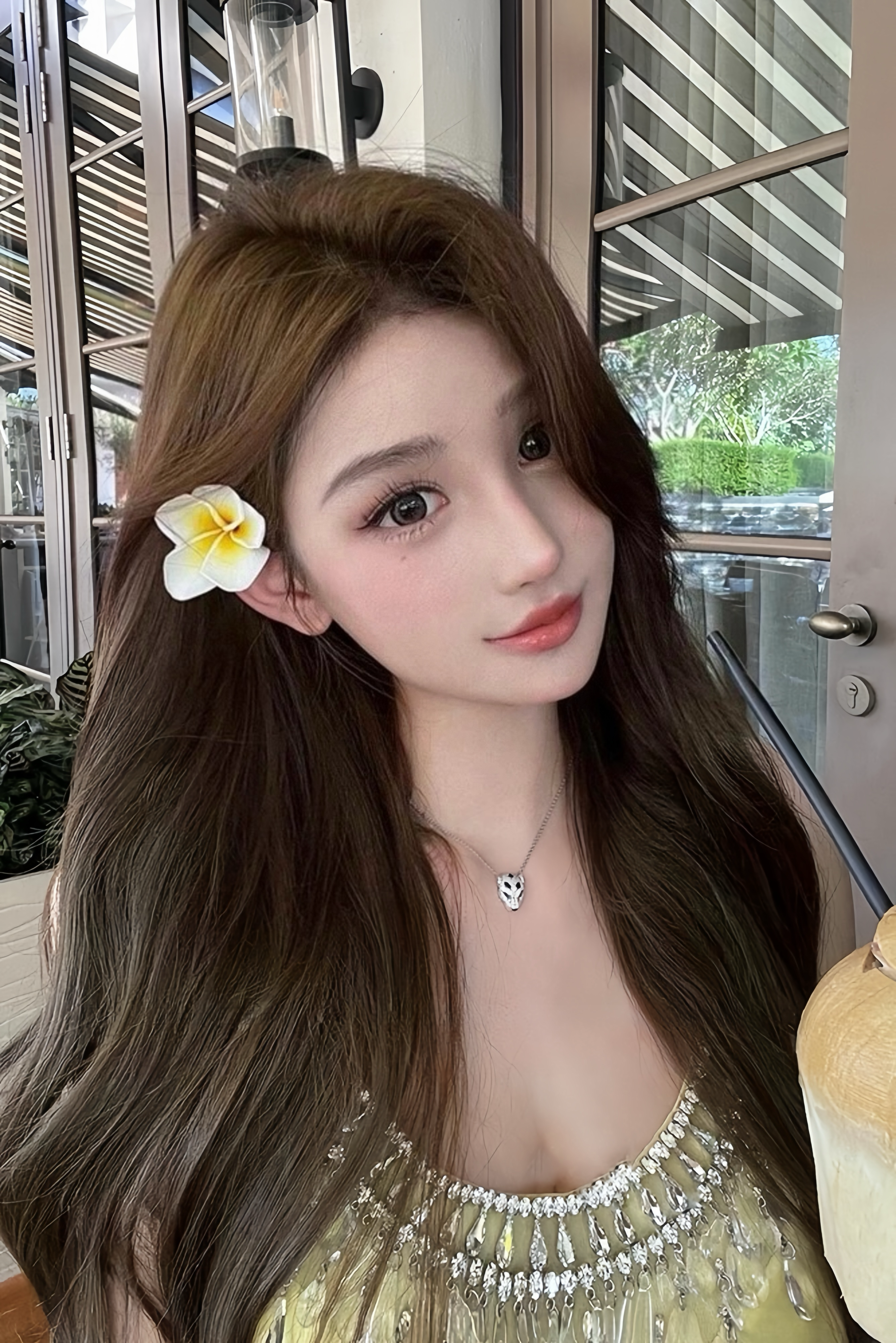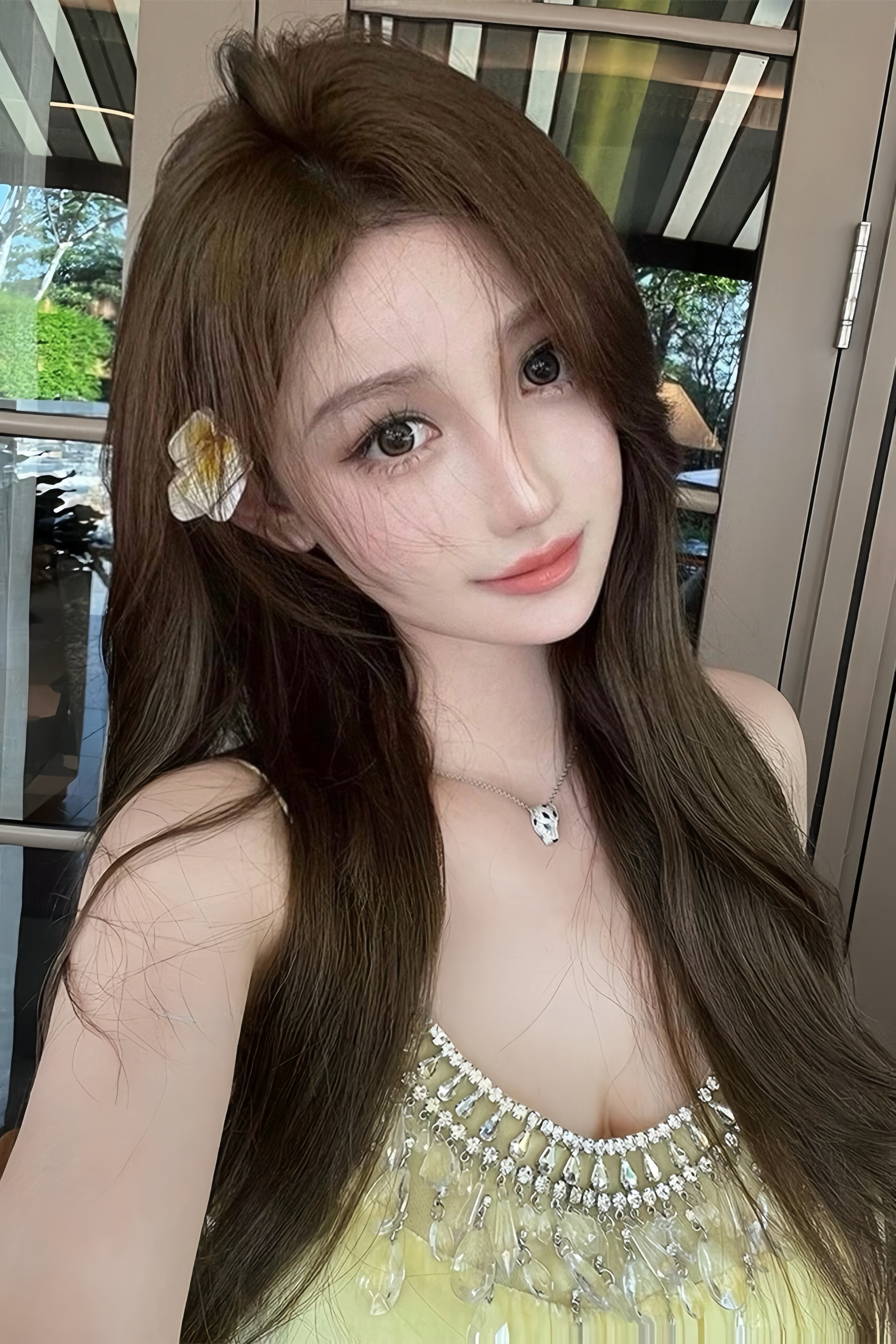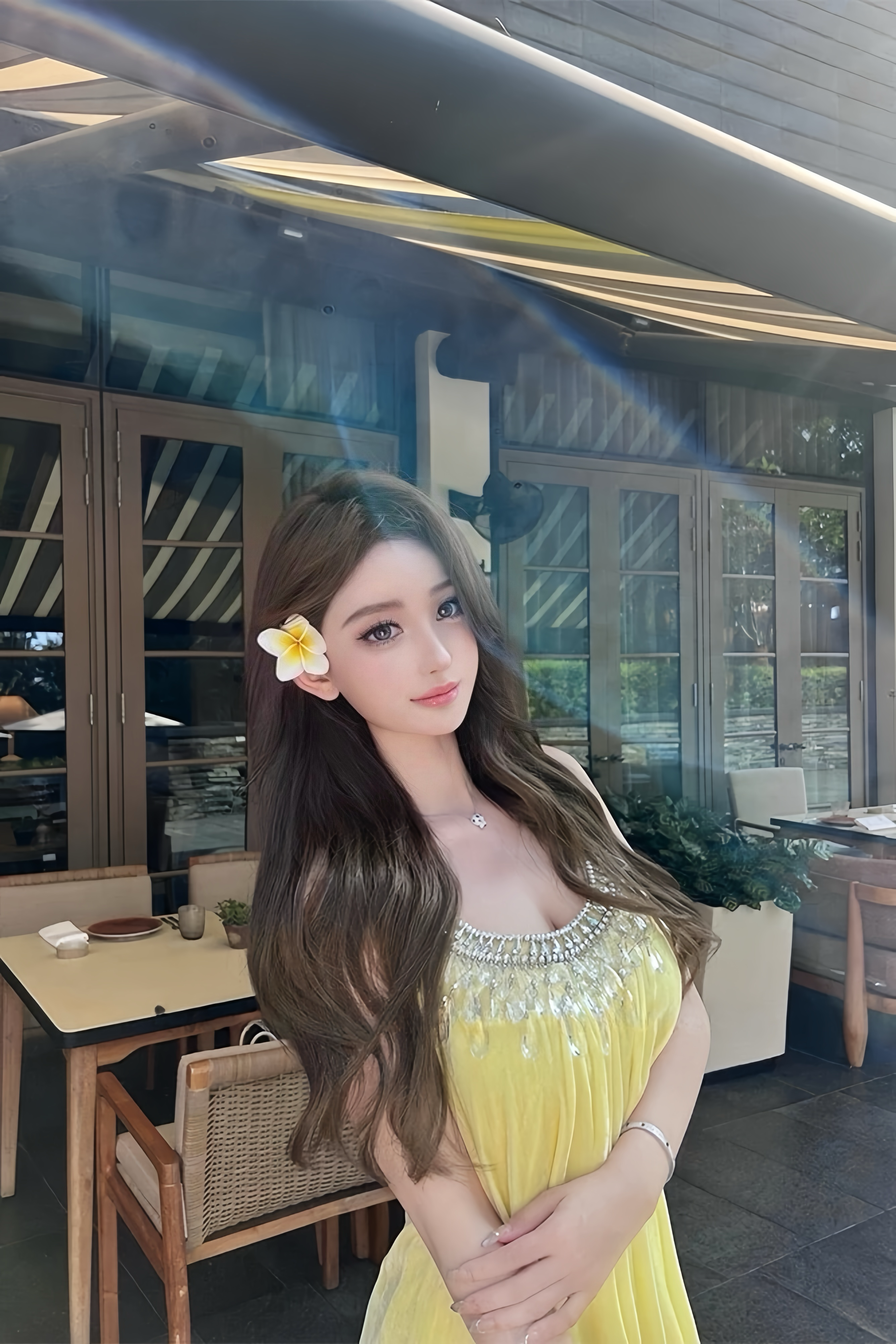 Woman in a yellow dress standing outdoors with greenery and a building in the background