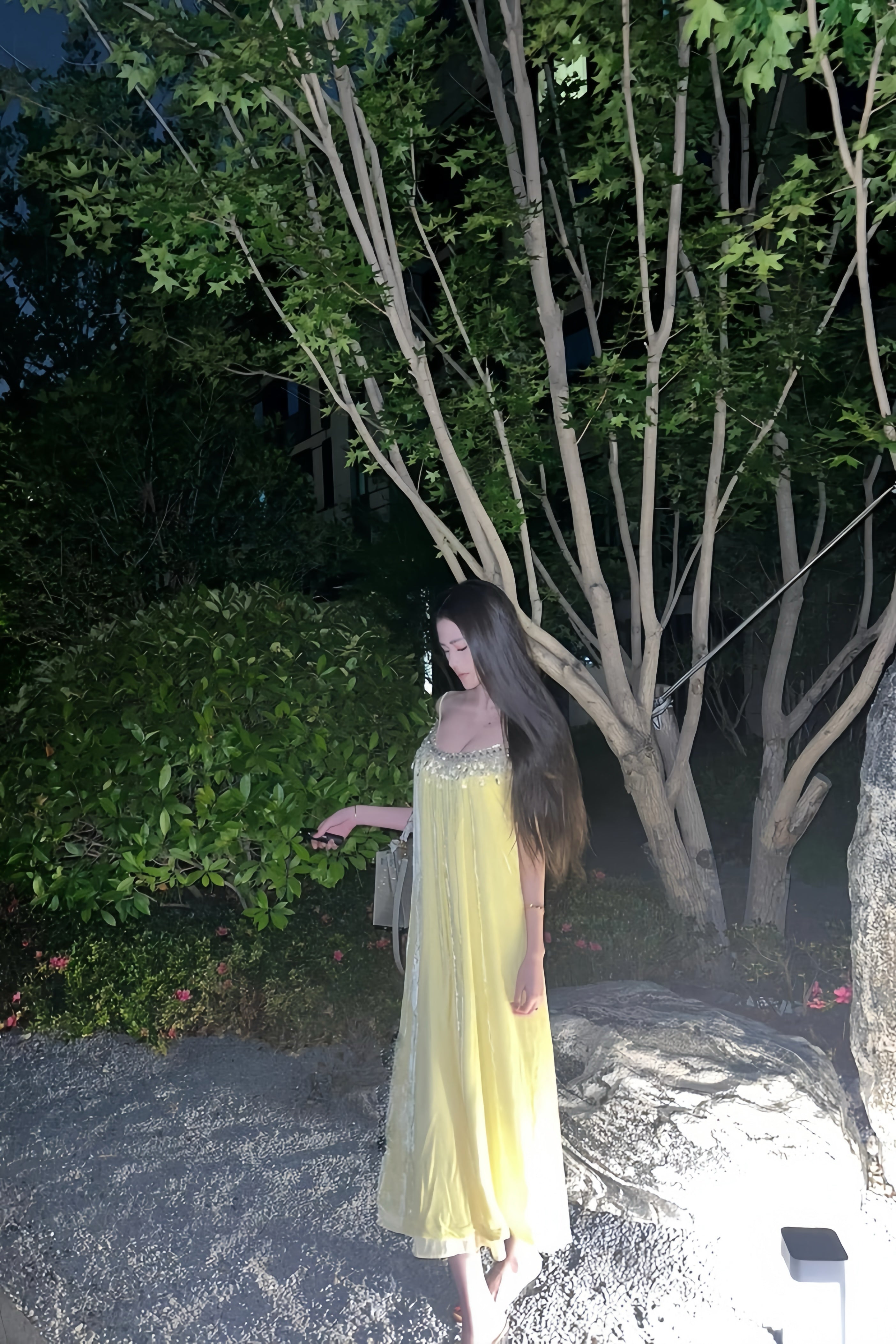 Woman in a yellow dress standing outdoors near trees at night.