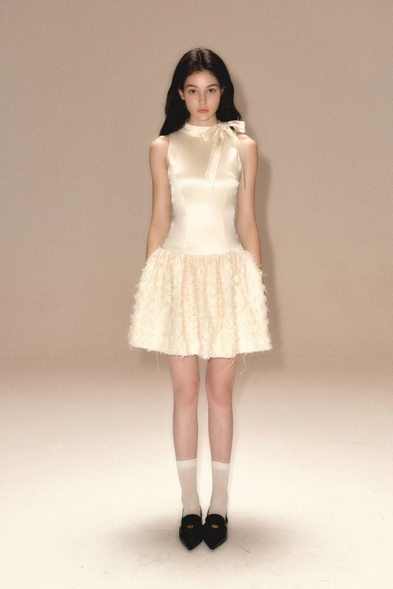 Step into timeless elegance with this ivory satin bow mini dress, designed to capture attention at every special occasion. Featuring a high neckline with a delicate side bow and a textured feather-effect skirt, this dress balances refined sophistication with playful charm.