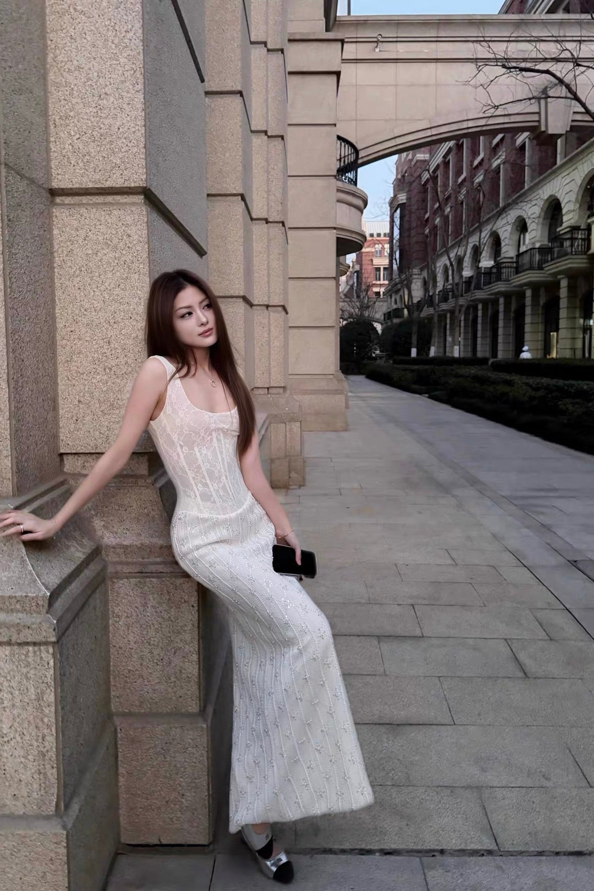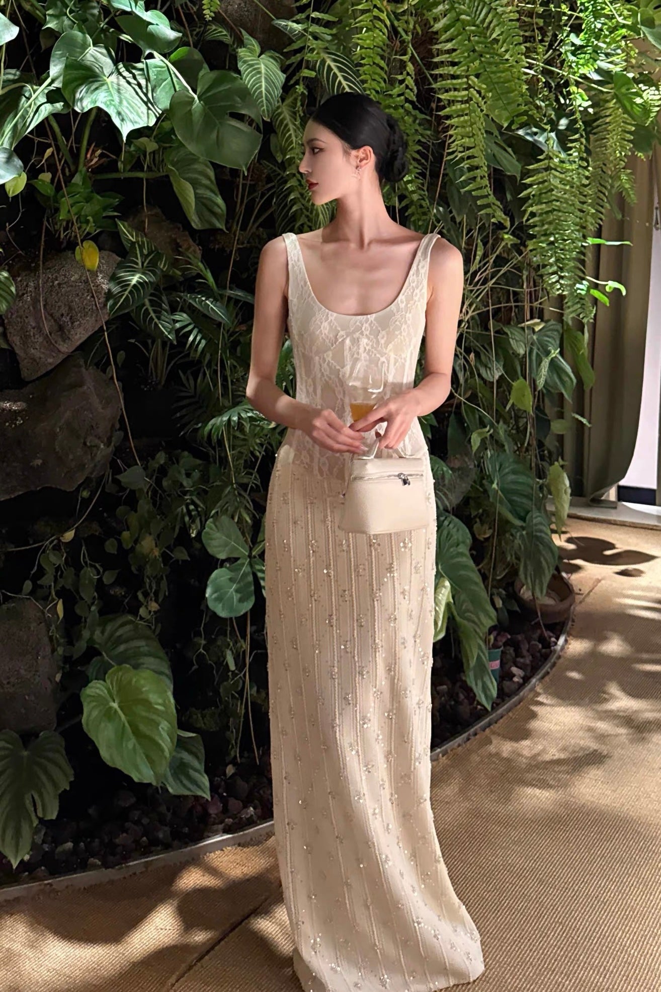 Vogsion Ivory Boned Corset Lace Beaded Maxi Dress