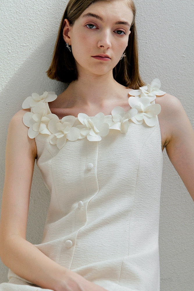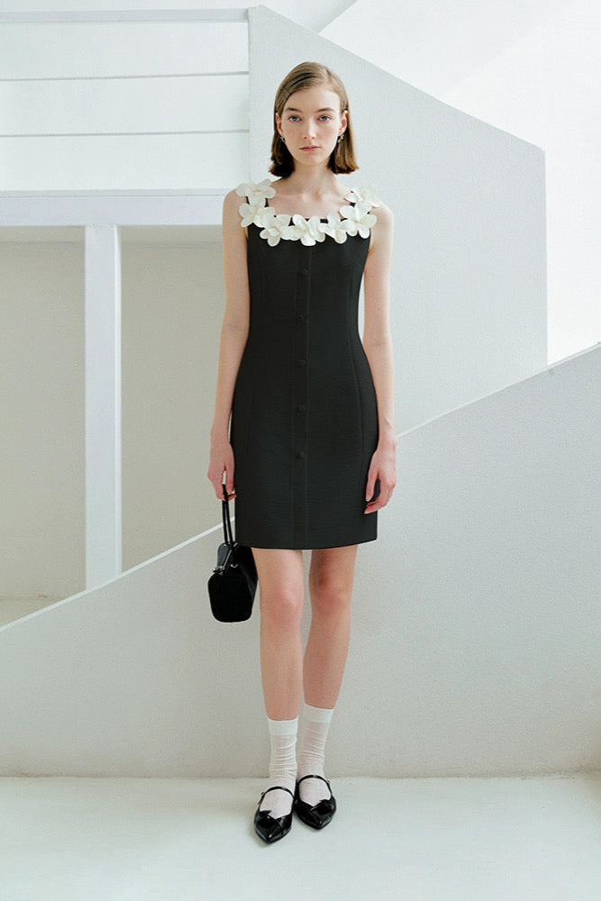 Elevate your wardrobe with this Floral Petal Collar Mini Dress, a timeless piece that blends elegance with modern minimalism. Crafted in a textured fabric, this sleeveless sheath dress features a 3D floral appliqué neckline, adding a romantic and feminine touch to its clean silhouette. The button-down front detail enhances the refined structure, while the mini length makes it versatile for cocktail parties, evening dinners, or chic daytime events.