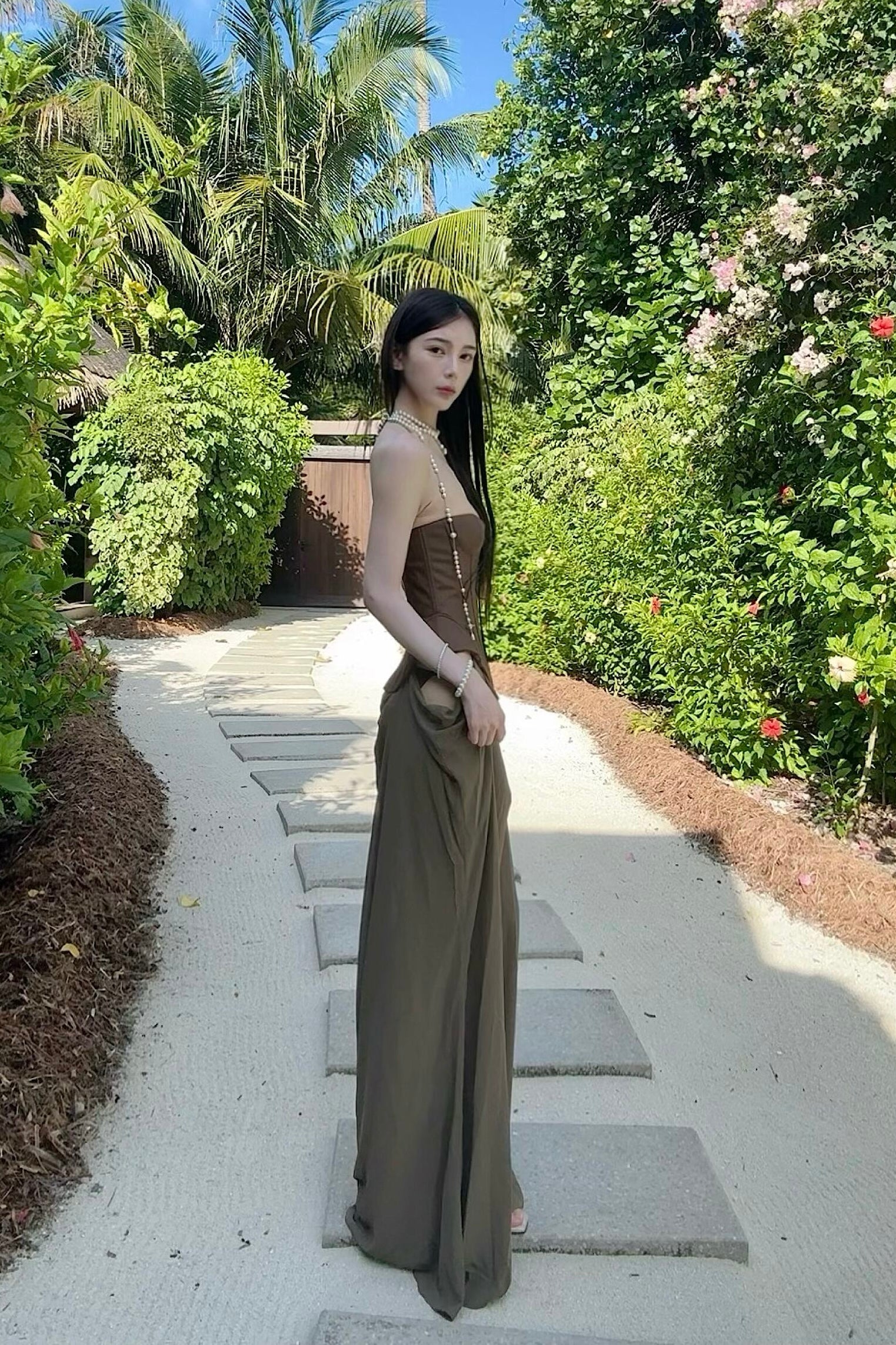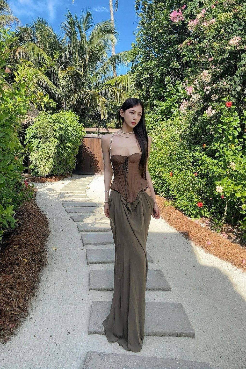 Vogsion Aphrodite Draped Set on a real customer featuring a chocolate brown lace-up corset top and moss green low-waist maxi skirt with hip cut-outs in a tropical resort setting.