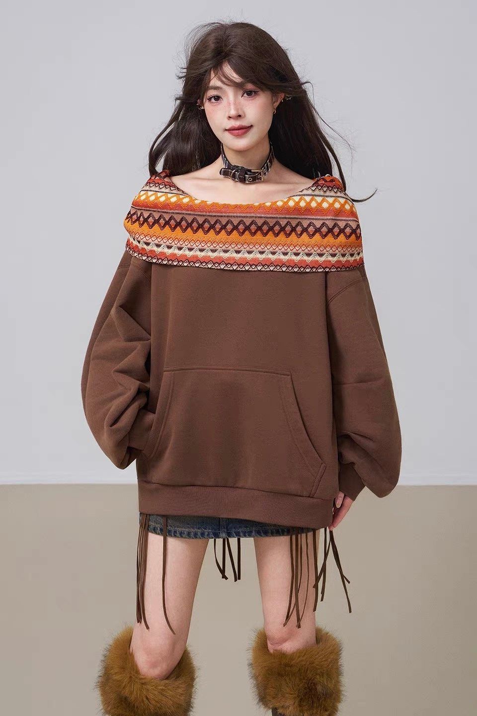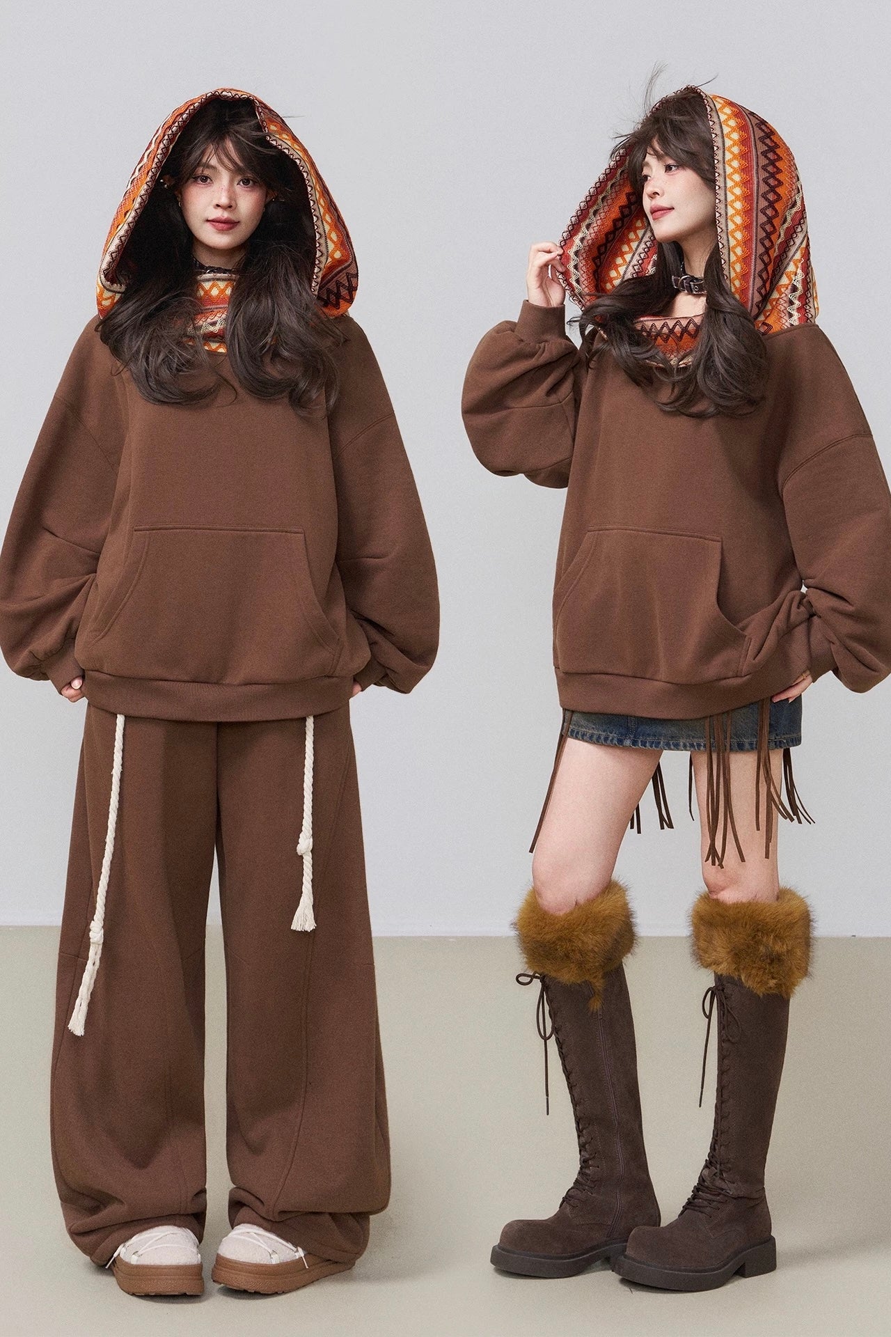 Vogsion Boho Jacquard Hood Fleece Oversized Pullover Hoodie