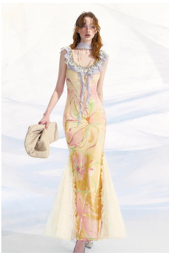 This ethereal piece features a soft watercolor butterfly print on a sculpted mermaid silhouette, trimmed with delicate ivory lace inserts that flow gracefully as you move. The ruffled lavender neckline and pearl-like embellishments evoke a vintage Renaissance aura, while the fitted waist elongates your figure in the most effortless way.
