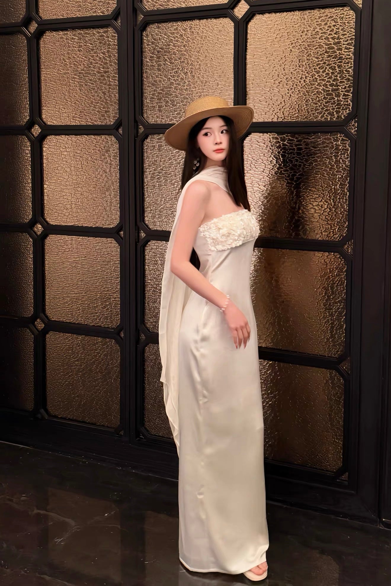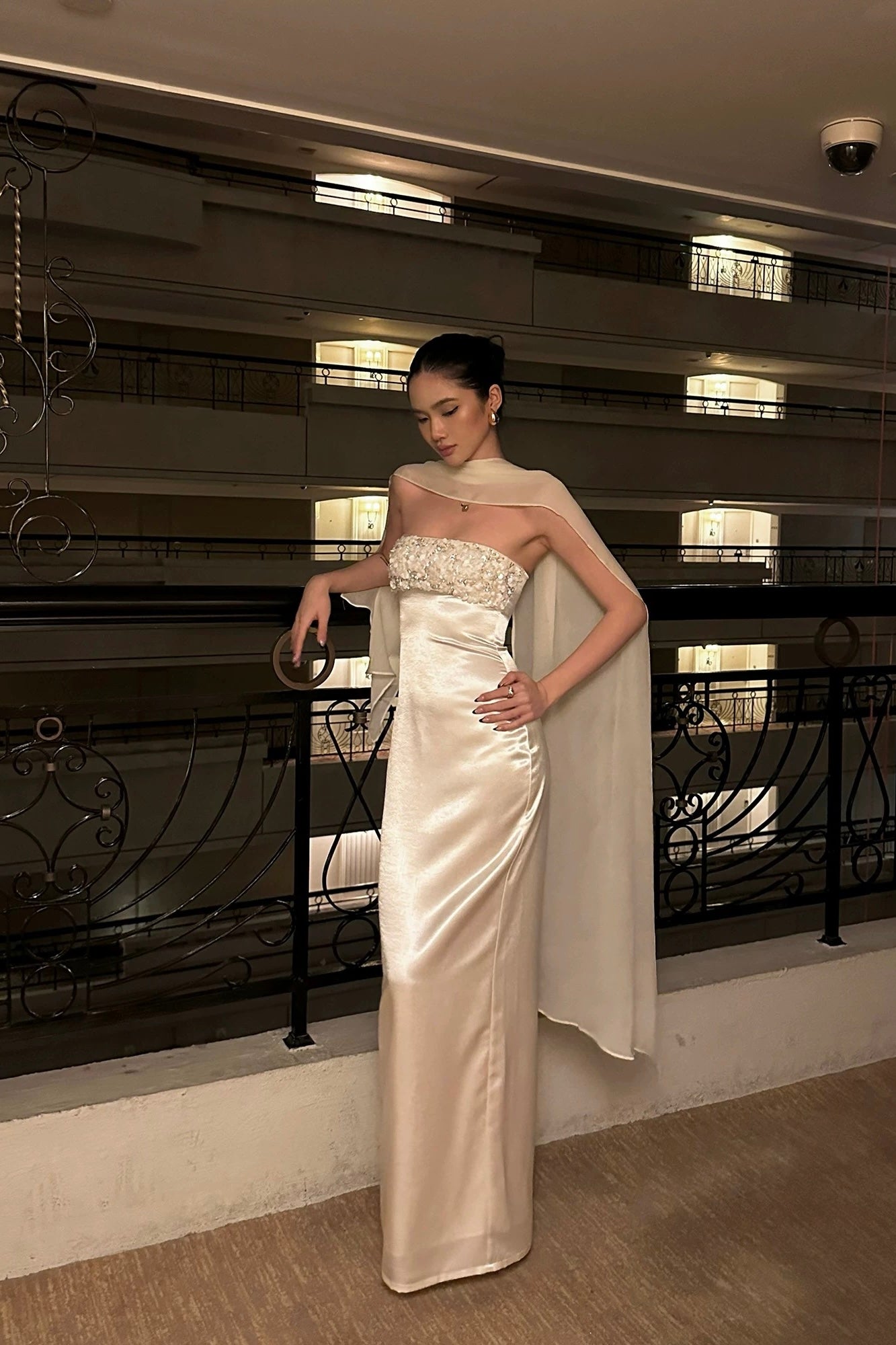 Vogsion Celeste Ivory Satin Cape Gown – Strapless Beaded Bodice Column Maxi