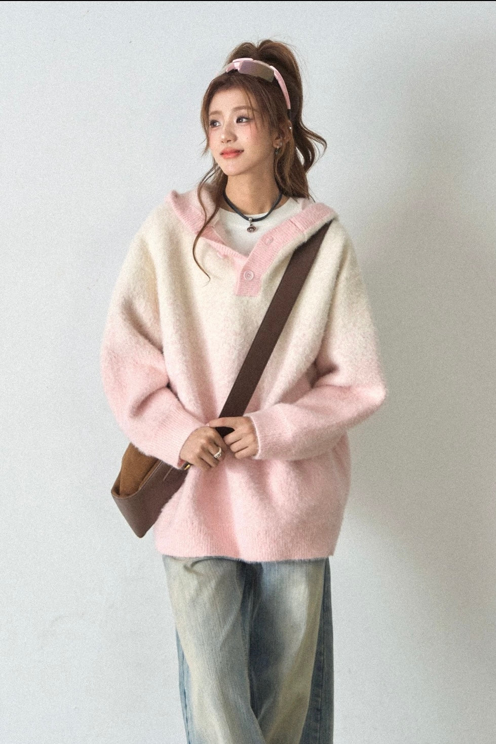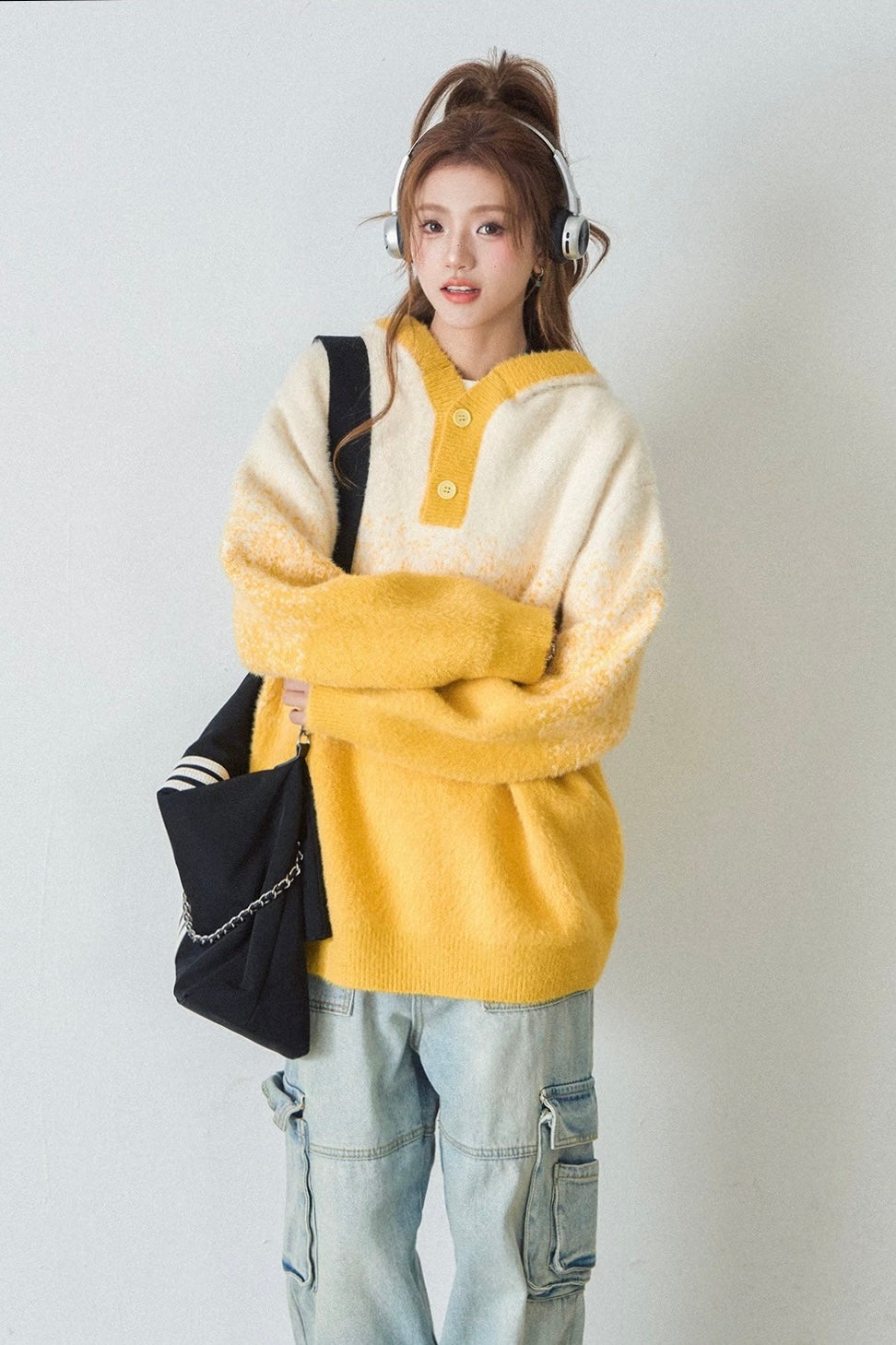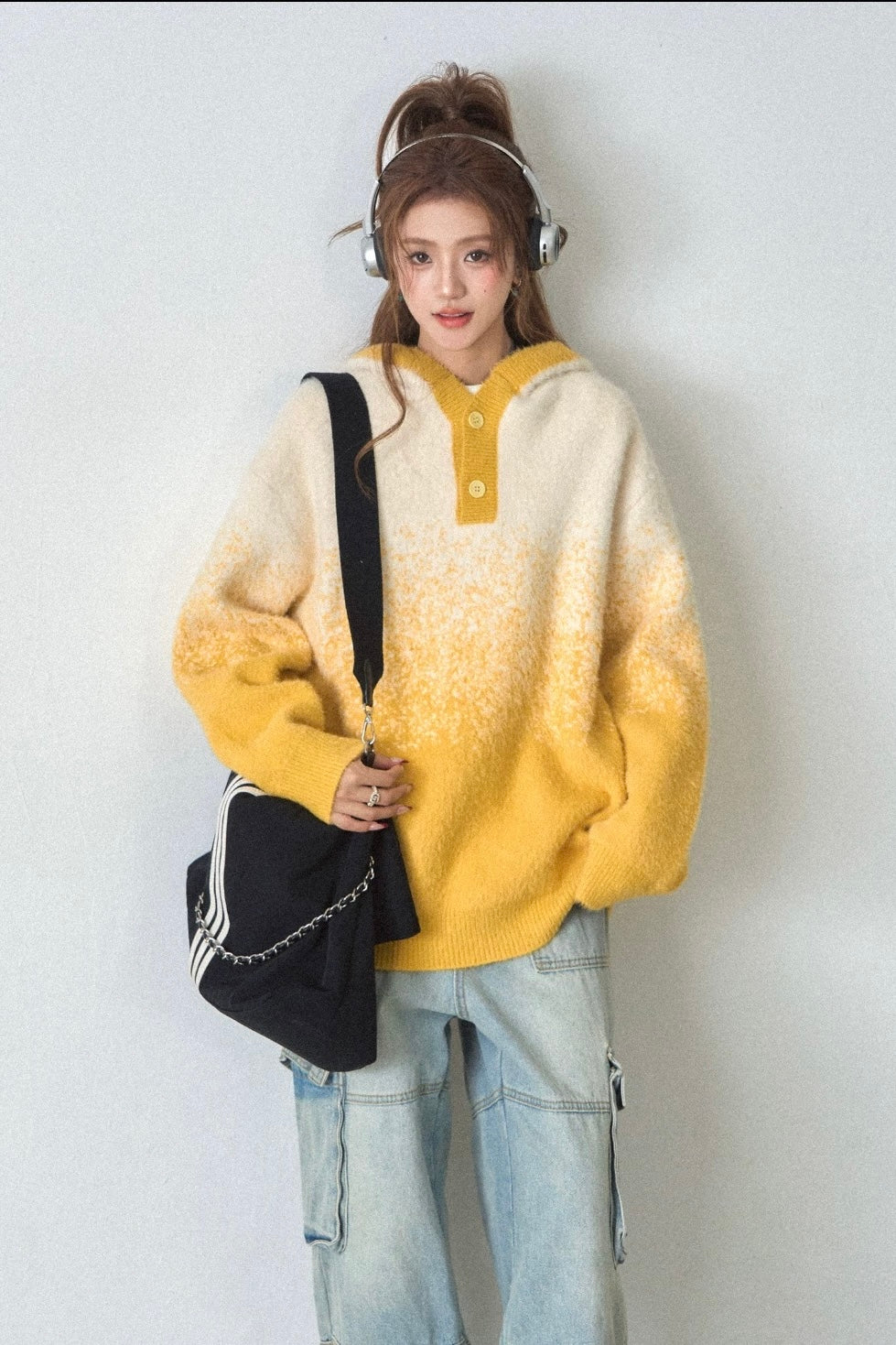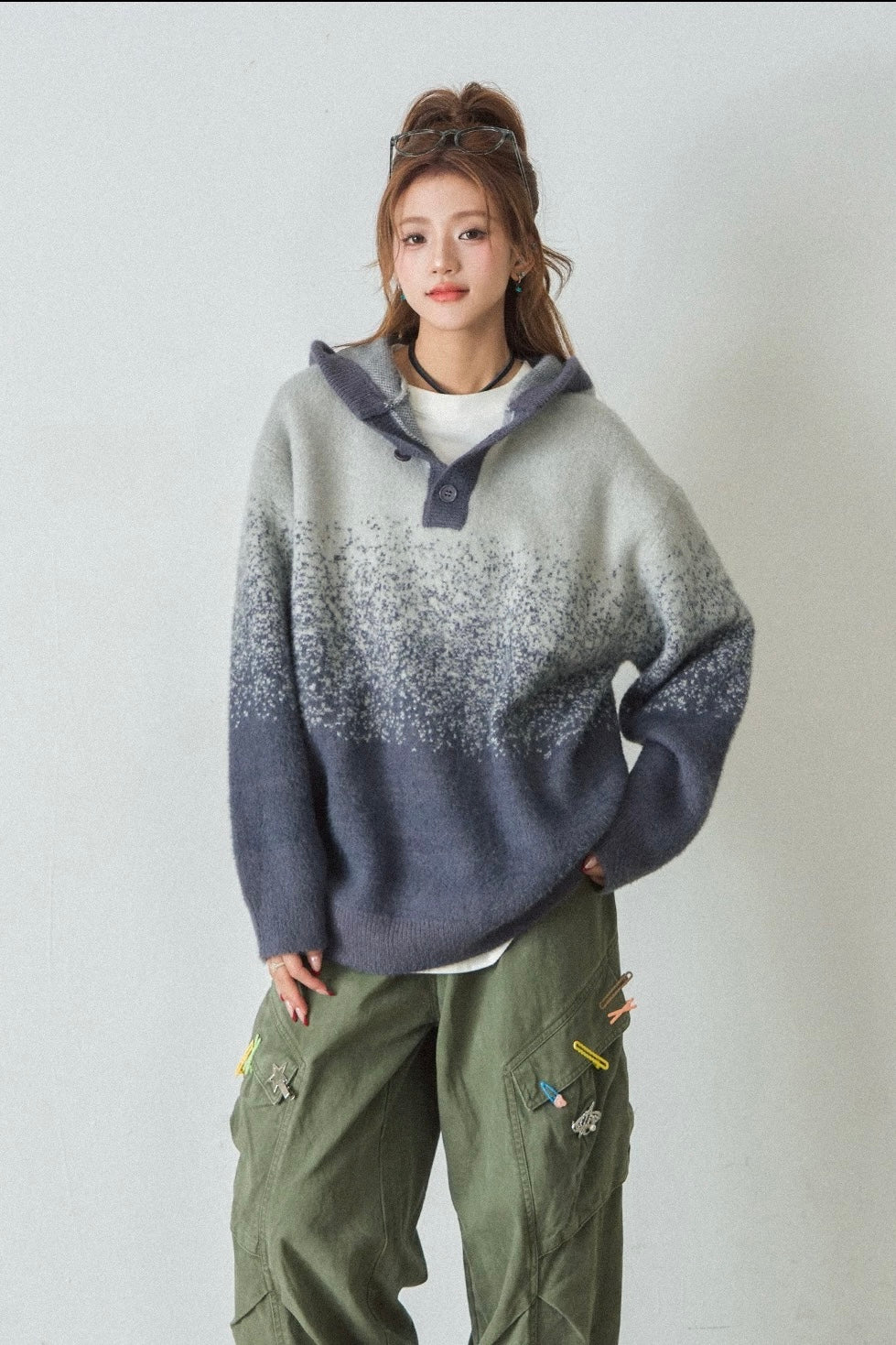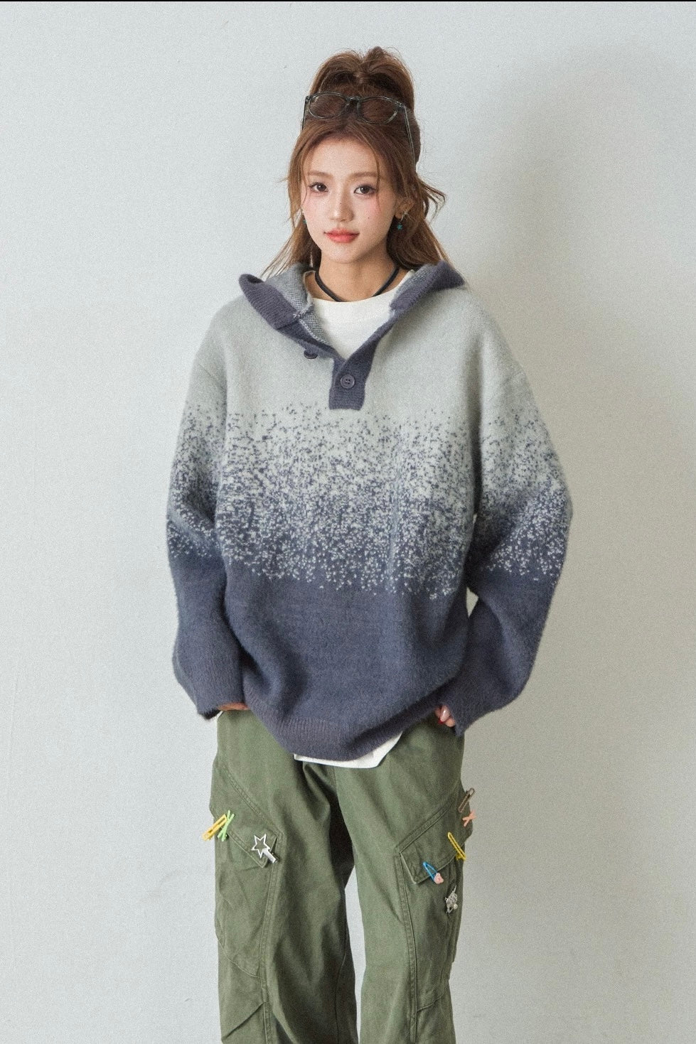 Vogsion "Aura Gradient" Mohair-Blend Henley Hoodie | Oversized Ombre Knit Sweater for Gen-Z Aesthetic