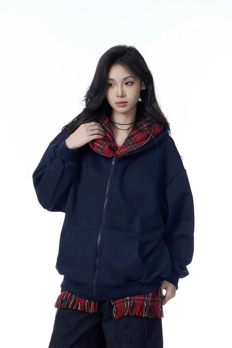 When zipped up, the plaid lining adds a textured pop of contrast. When removed, it becomes a standalone plaid scarf — perfect for layering or styling as an accessory. Whether you’re going for a laid-back campus look or a statement fall outfit, this hoodie adapts to you.