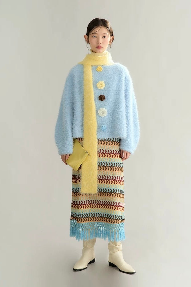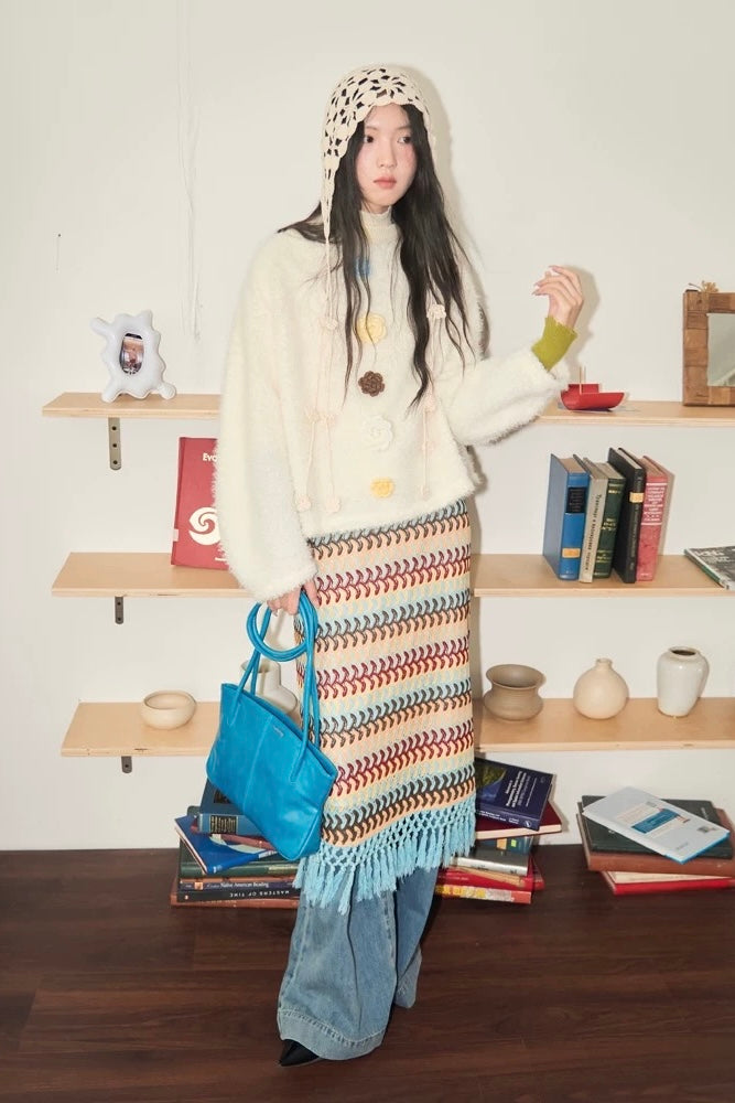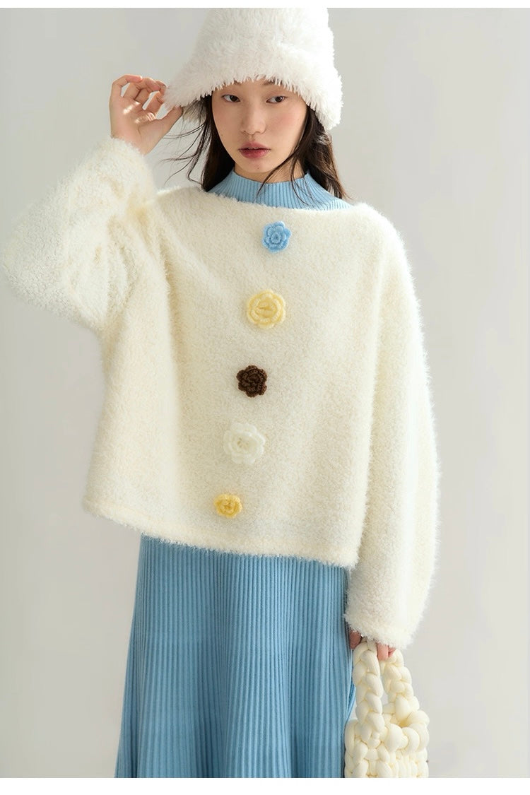 This fluffy texture knitwear features handmade 3D crochet flower appliques in pastel yellow, brown, white, and sky blue tones, giving it a unique vintage and Korean aesthetic look.