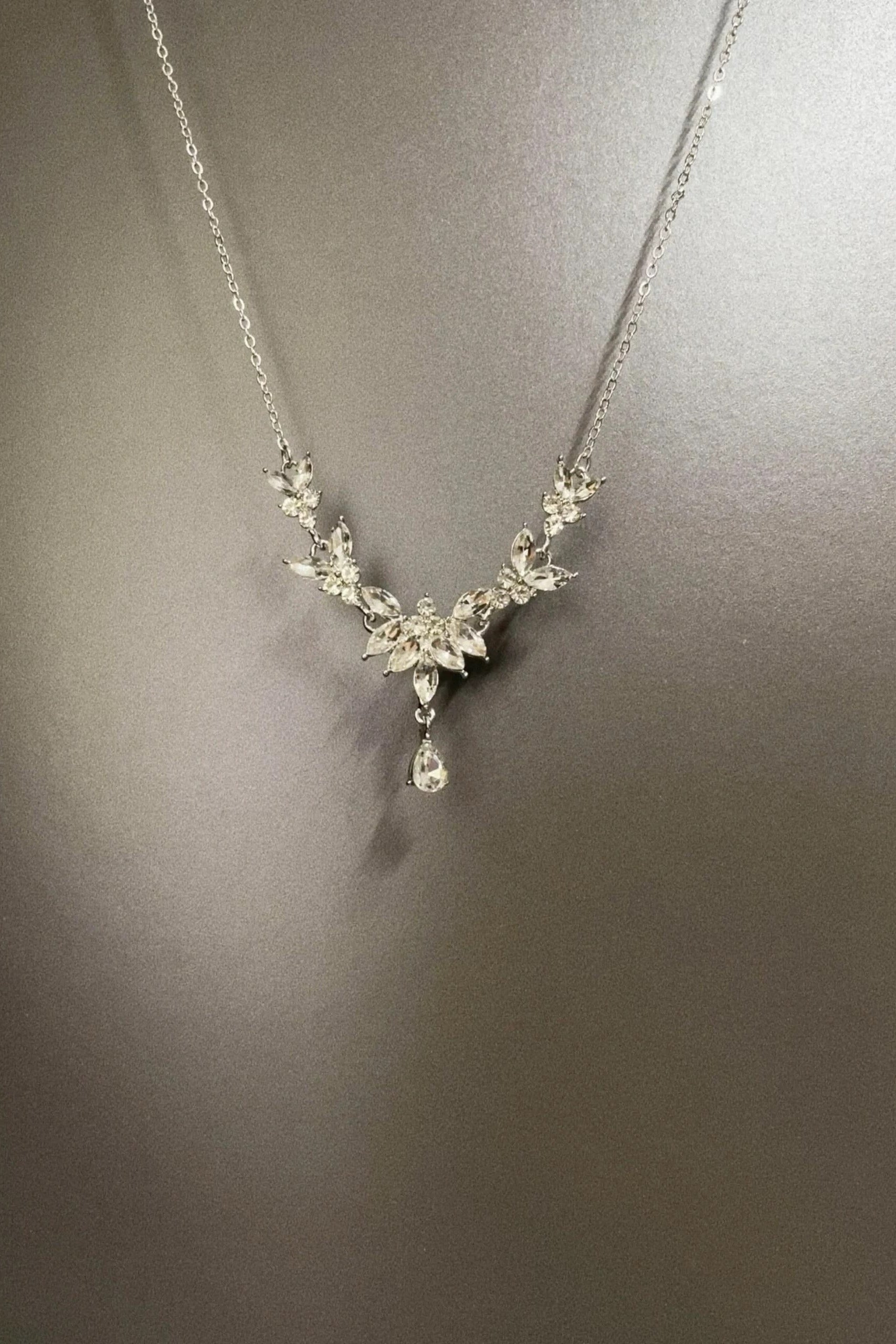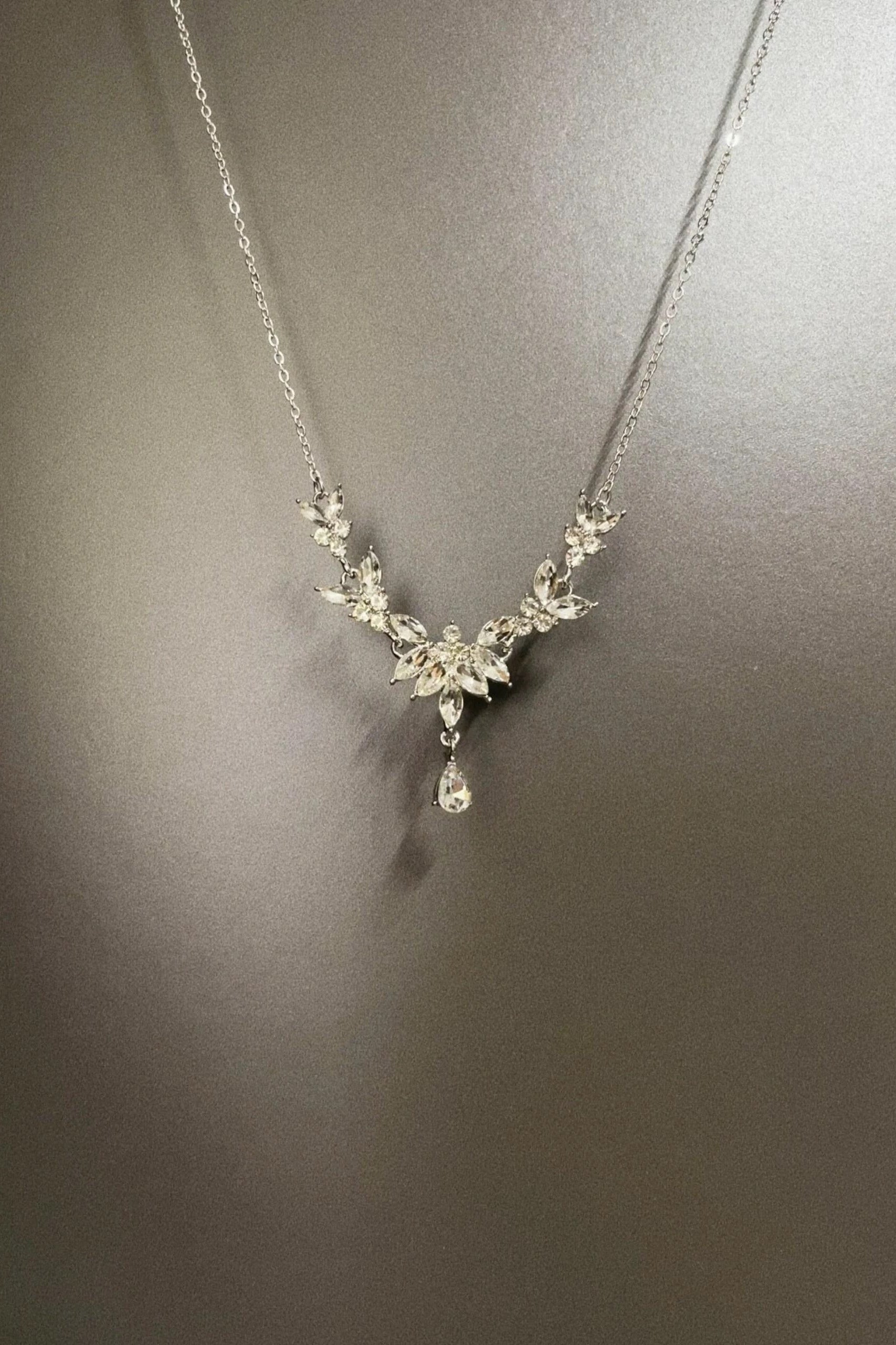 Crafted to capture the radiance of blooming petals, this necklace features marquise-cut crystals arranged in a delicate floral composition, centered with a single teardrop pendant that shimmers with every movement.