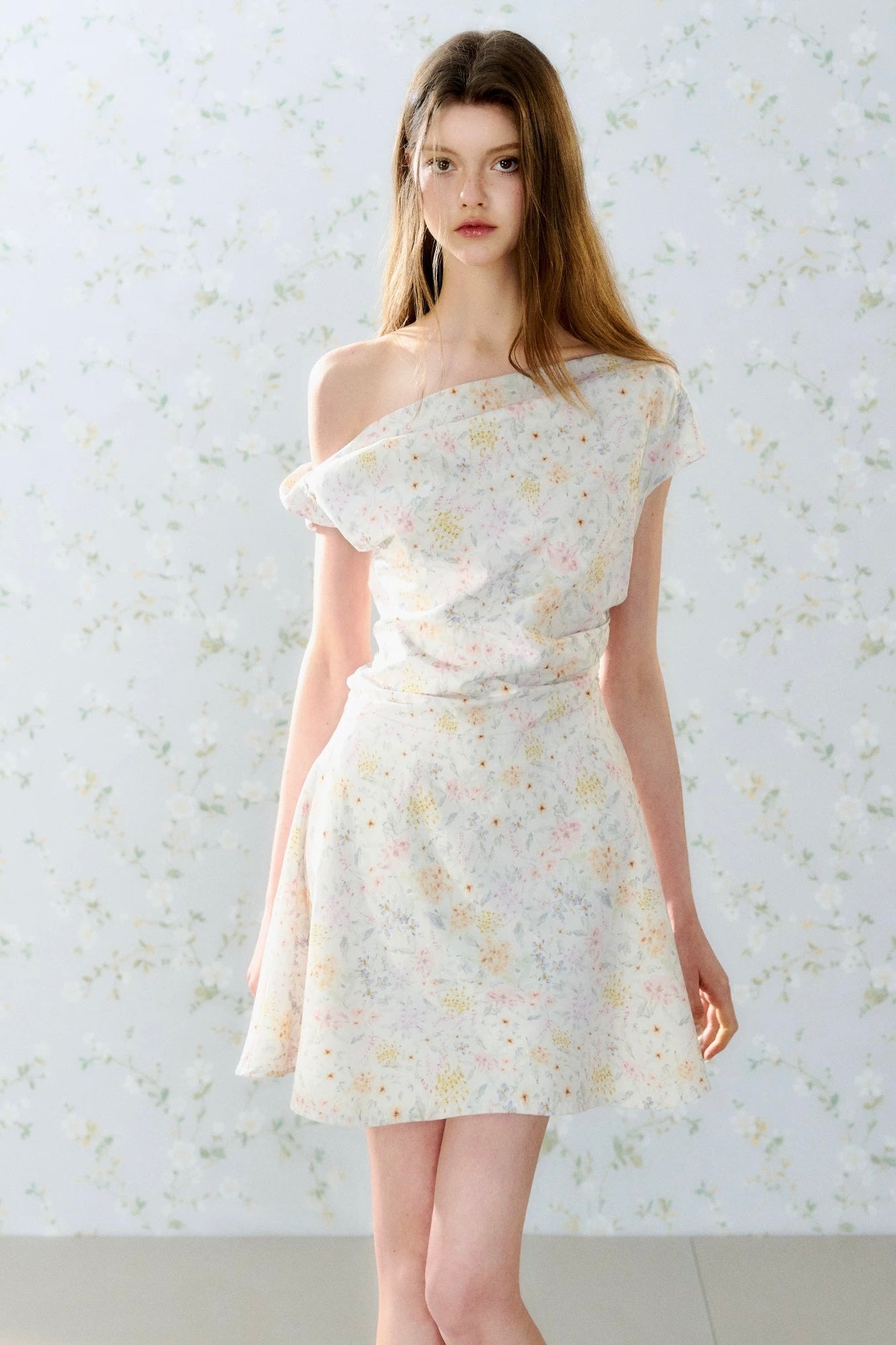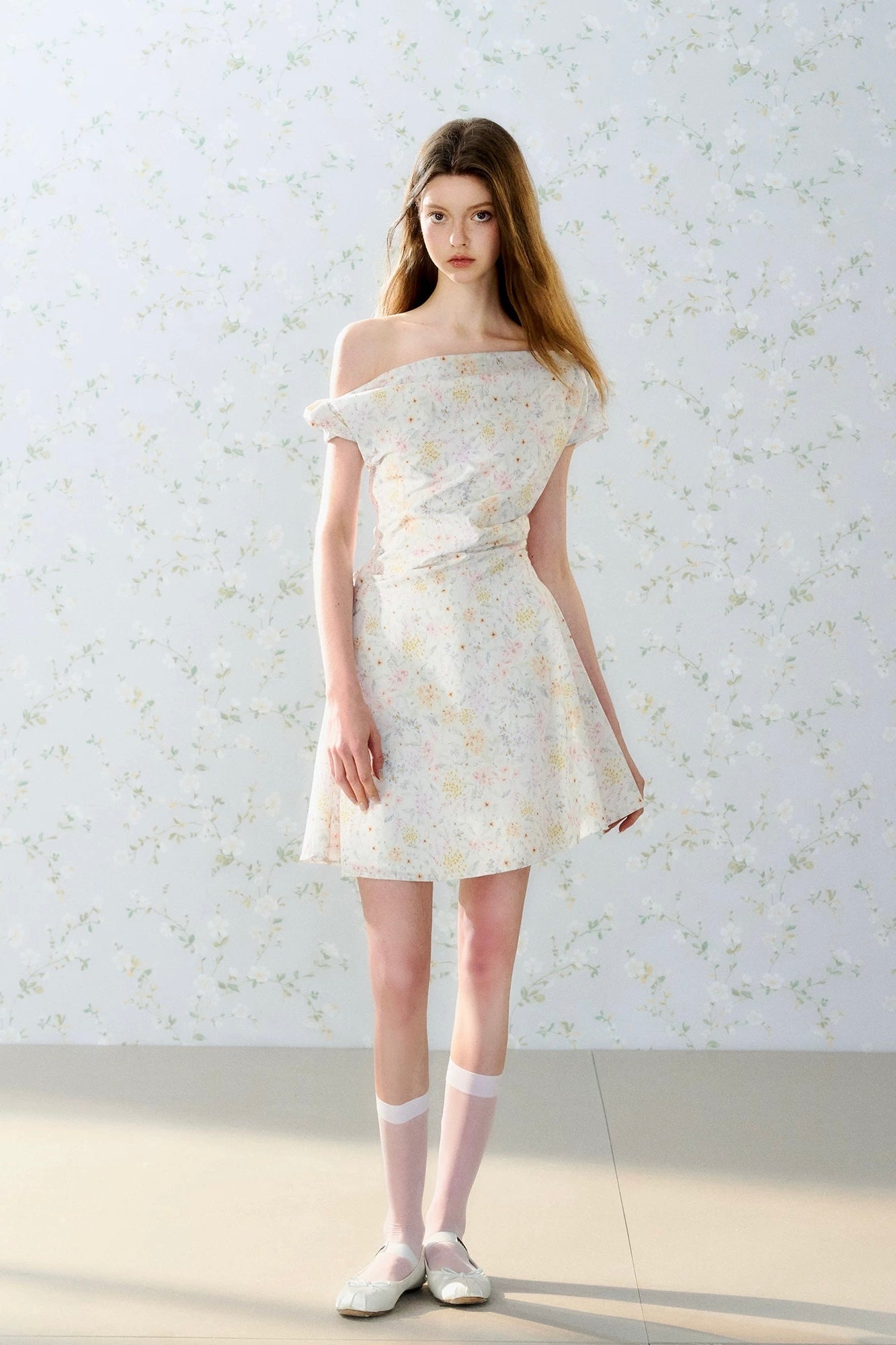 Designed with a romantic off-shoulder neckline, it beautifully frames the collarbone and adds a gentle allure to your silhouette. The soft pastel floral print dances across a lightweight fabric, while the A-line mini skirt sways gracefully with every step, bringing a sense of freshness and youth.
