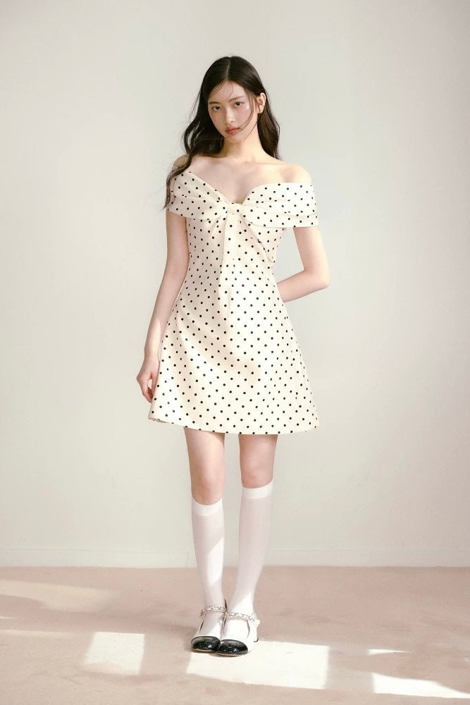 Retro-inspired polka dot A-line mini dress with elegant off-shoulder neckline, feminine and romantic aesthetic