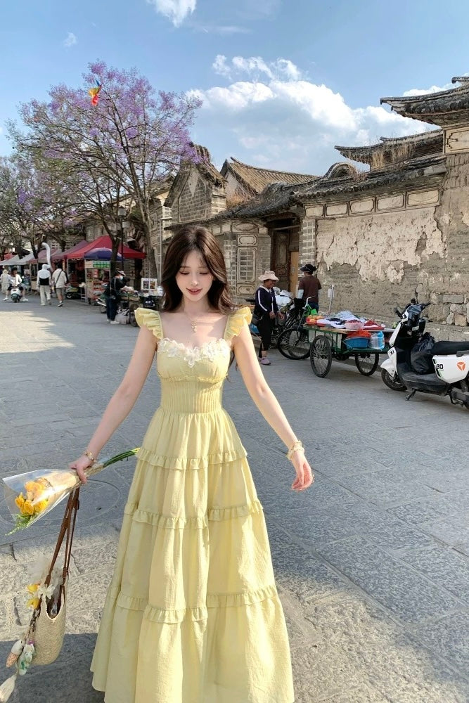 Crafted from breathable cotton-blend fabric in a soft lemon hue, this dress features flutter sleeves, delicate lace detailing at the neckline, and tiered ruffles that flow gracefully with every step.