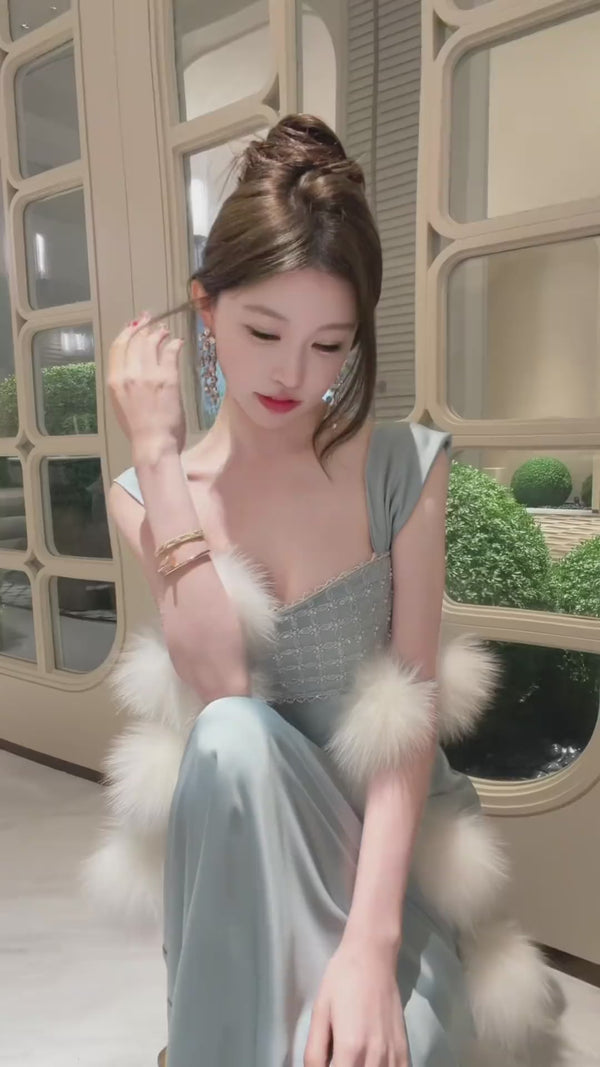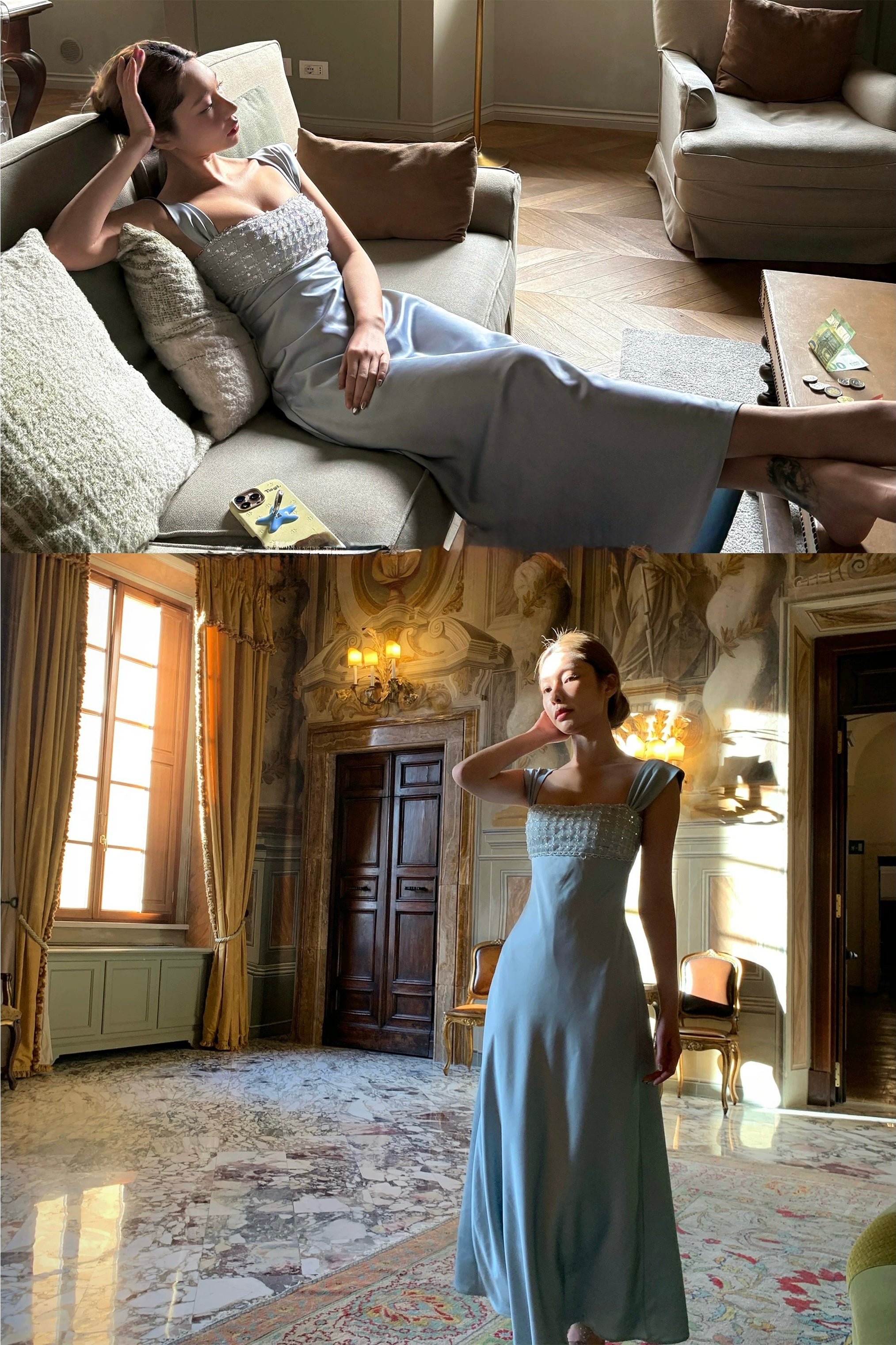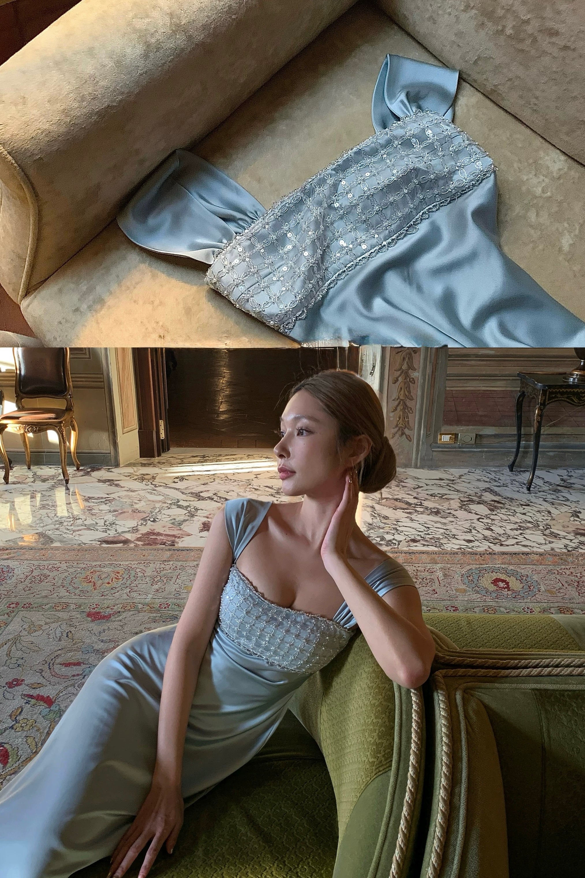 Vogsion Luxury Baby Blue Beaded Bodice Satin Prom Dress