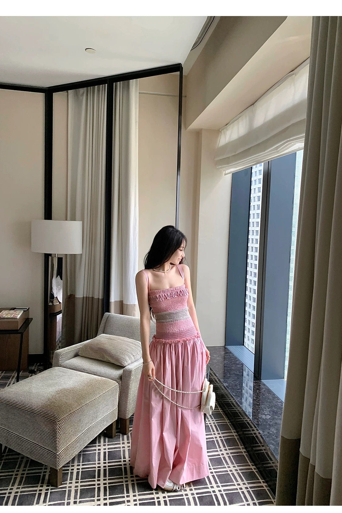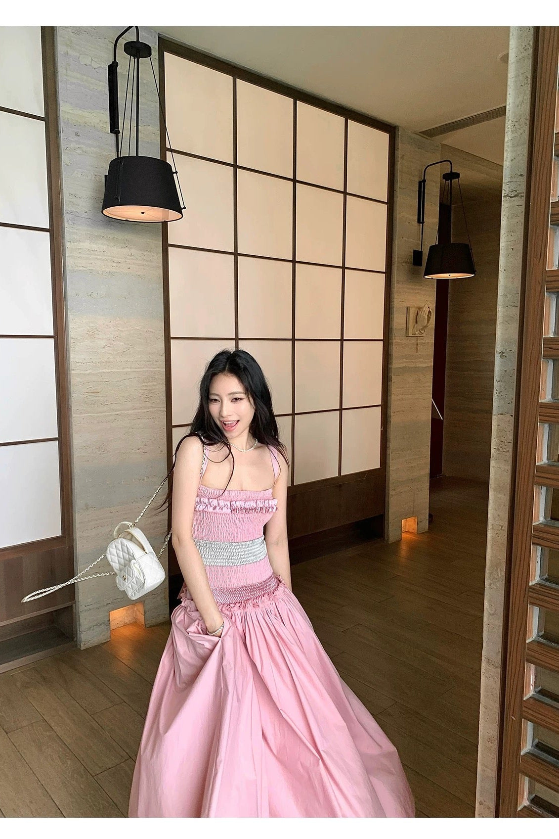 Vogsion “Whispering Petals” Fairy Smocked Maxi Dress – Pink / Sky Blue